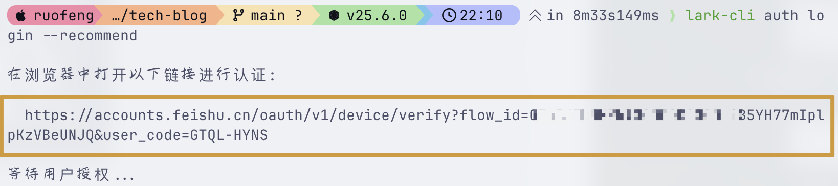 在后台运行此命令。它将输出一个授权 URL——提取该 URL 并将其发送给用户。用户在浏览器中完成设置后,该命令将自动退出。