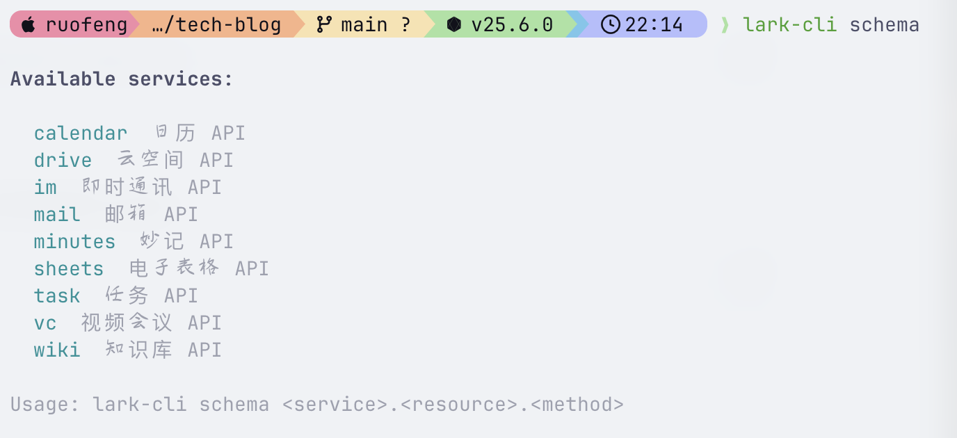 我们看 lark-cli 支持哪些 schema,lark-cli schema 是飞书 CLI 工具的一个子命令,用于查看飞书 API 的 Schema 定义(即数据结构和接口规范)。