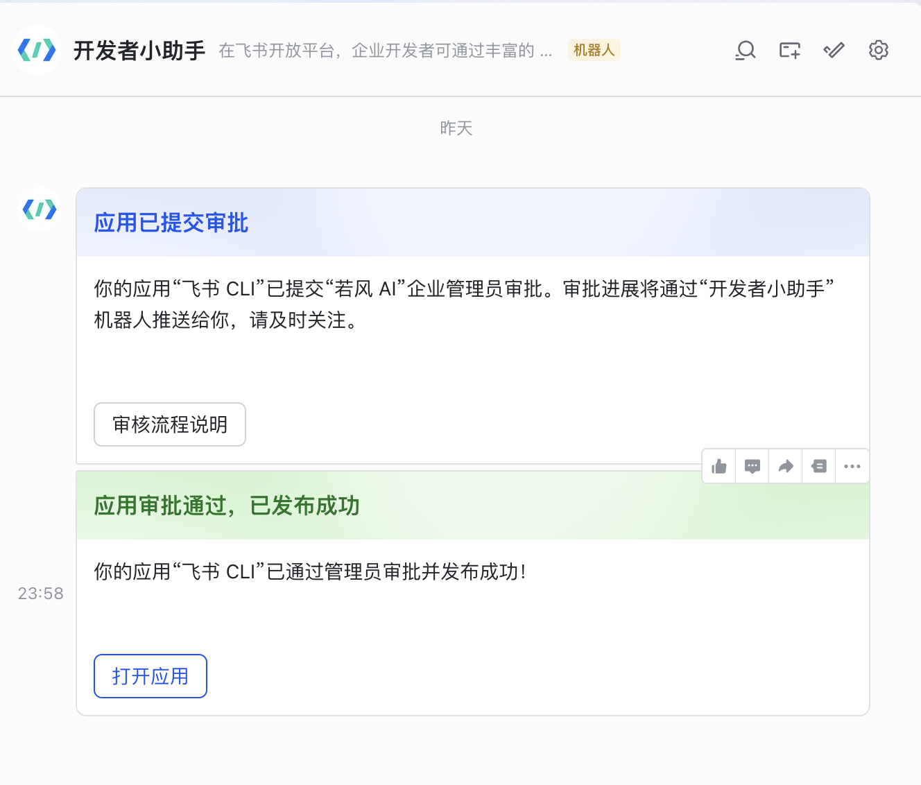 前面的步骤完成后,系统会自动通过 API 的方式帮你创建”飞书 CLI”机器人。