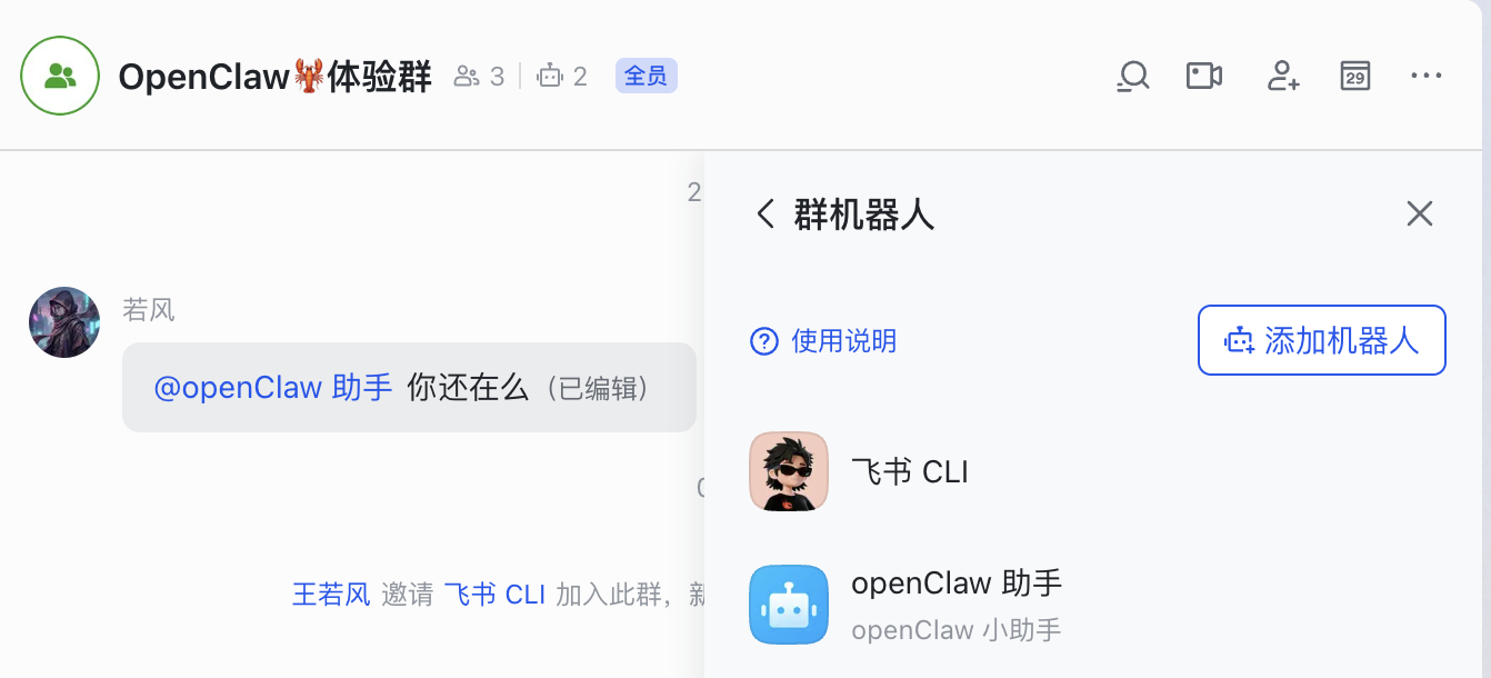 给飞书群”OpenClaw 体验群”中的若风发一条消息