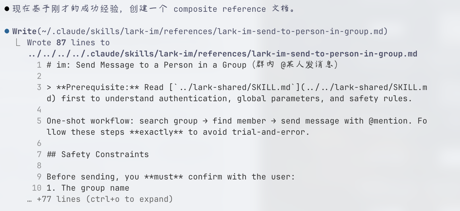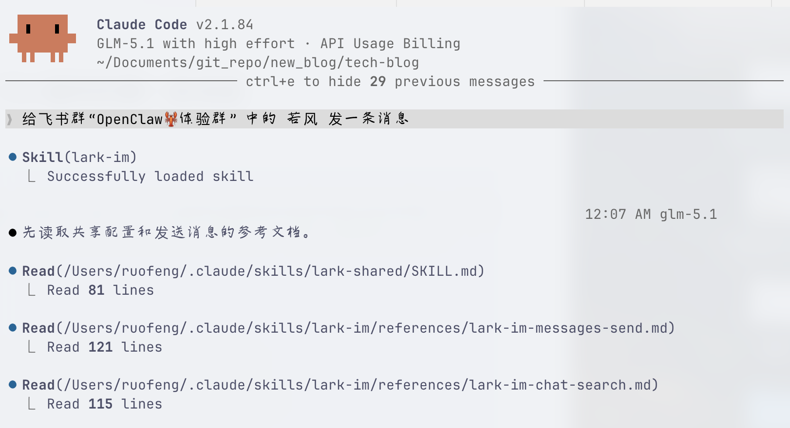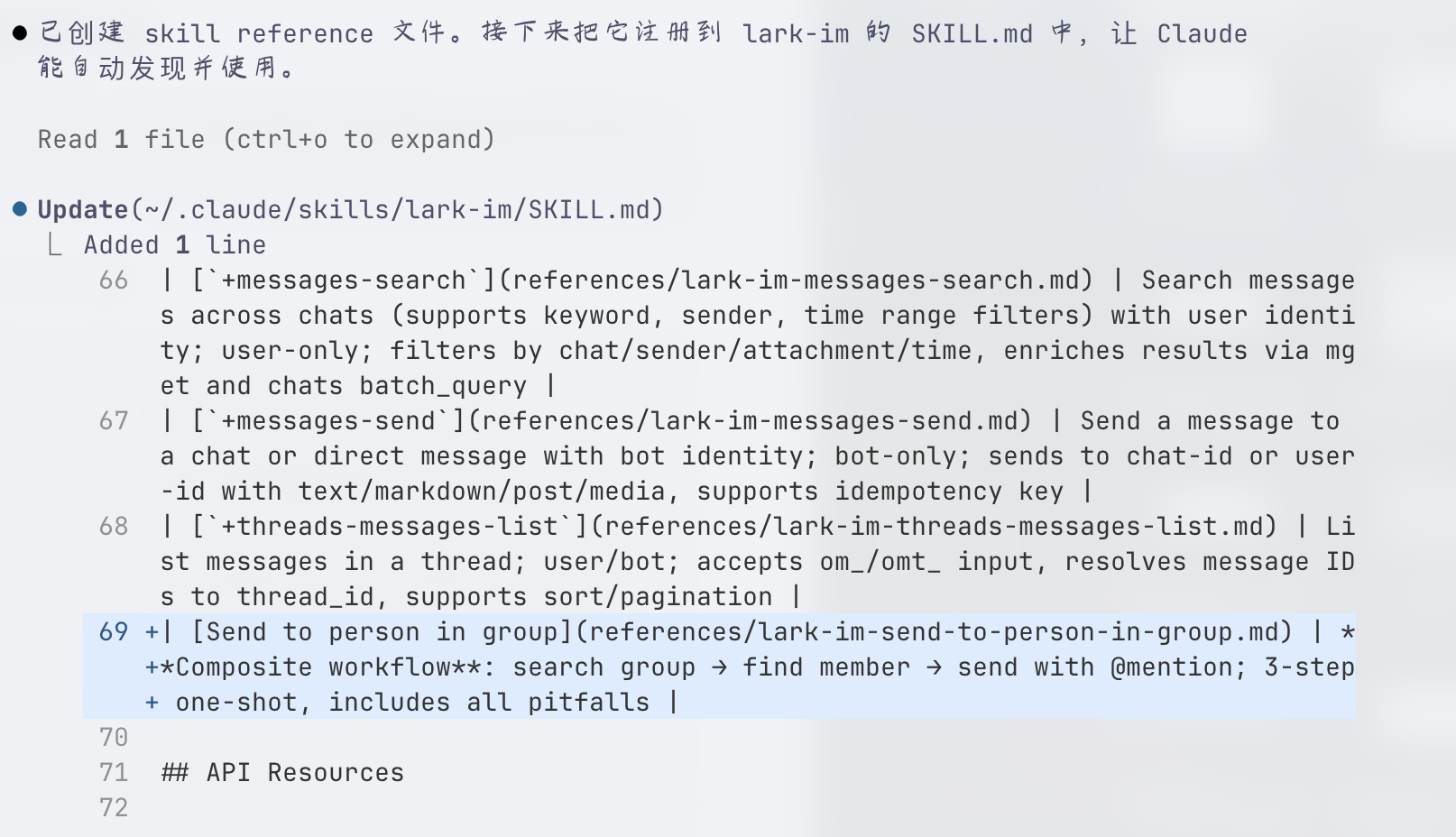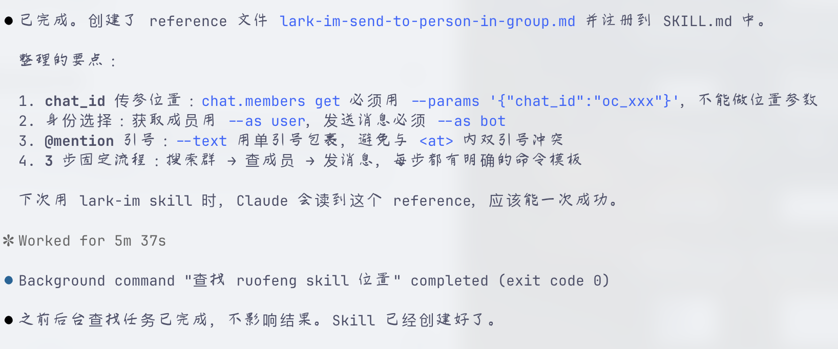 一会就创建完成,它直接更新了官方的 lark-im skill:
