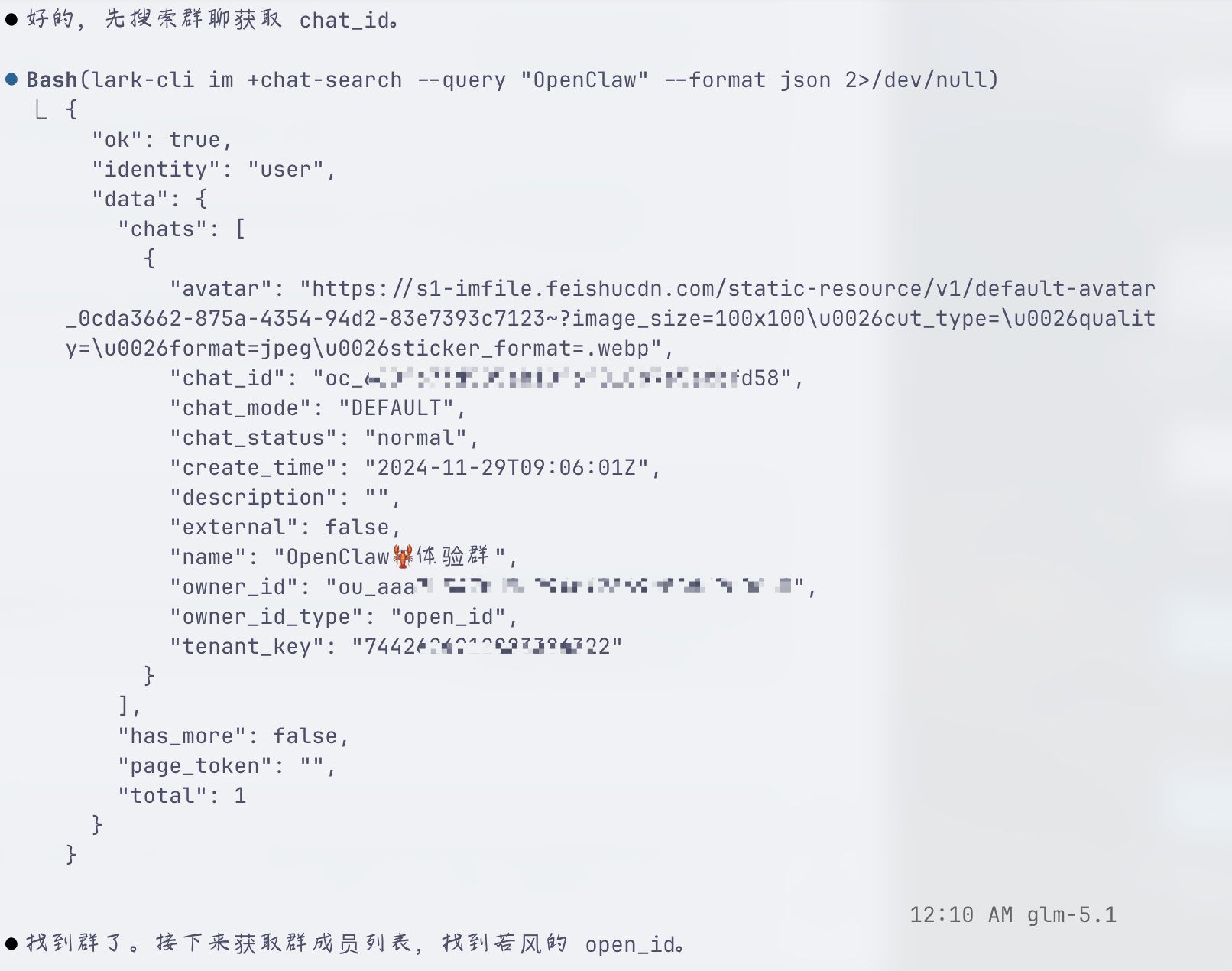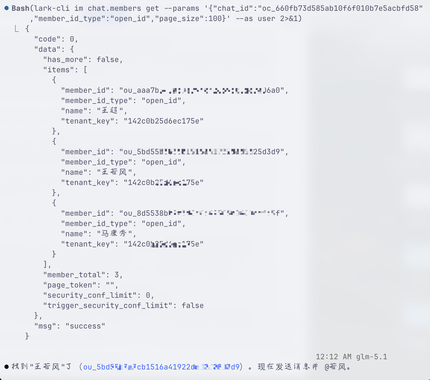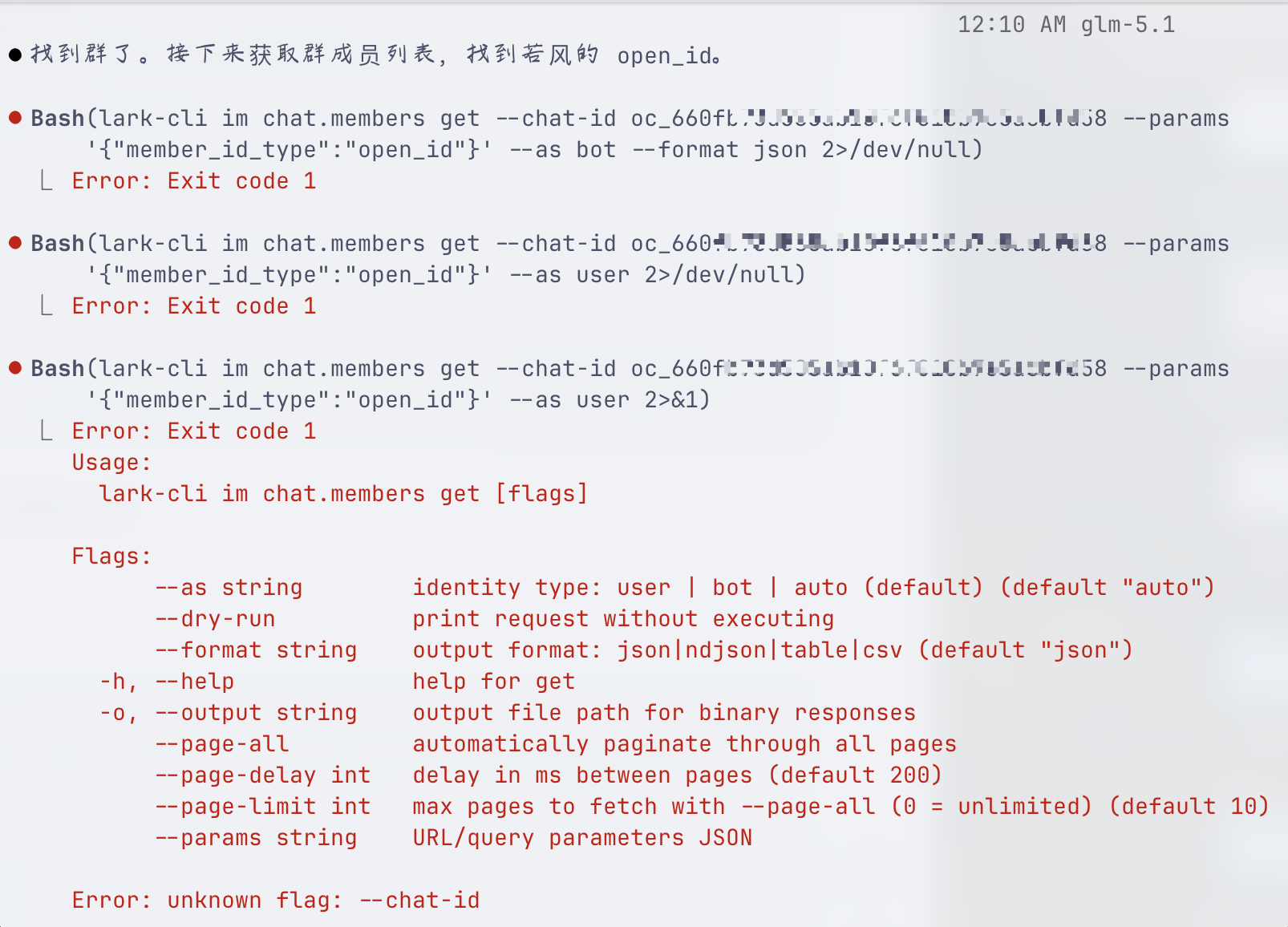 通过 lark-cli im chat.members get 尝试几次报错: