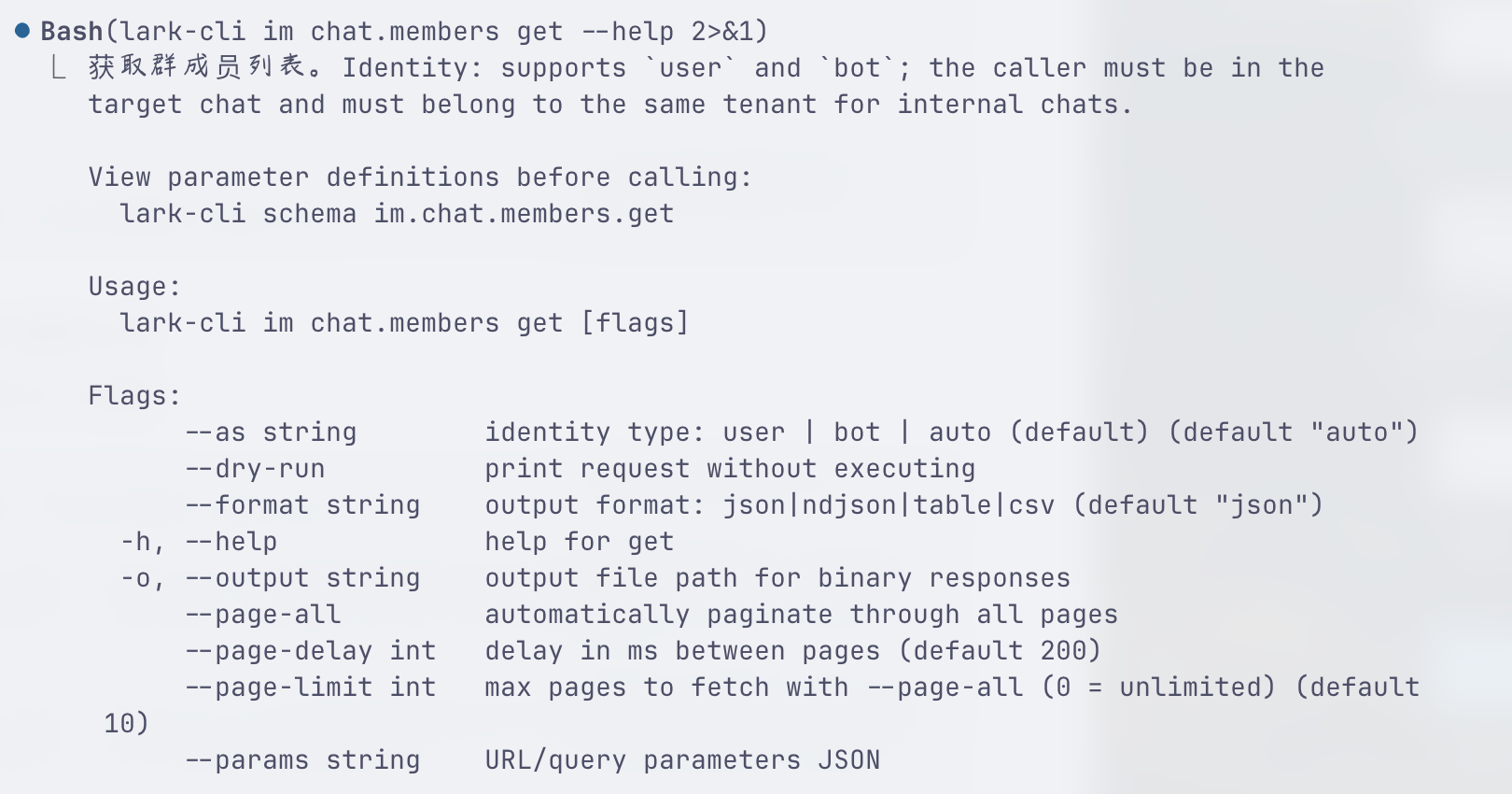 查询 lark-cli im chat.members get --help 方法,获取 im 的使用说明:
