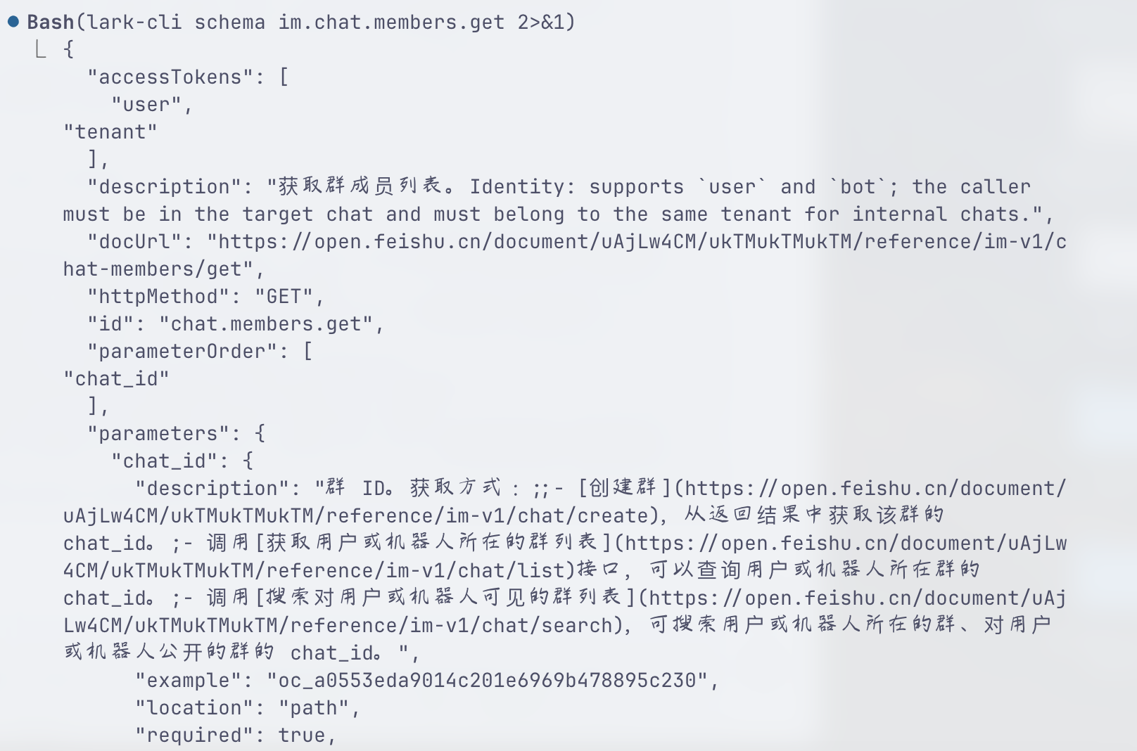 通过 lark-cli schema im.chat.members.get 方法,获取 im 的 schema: