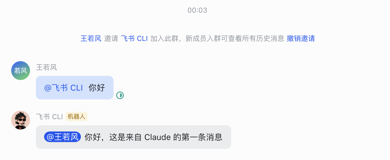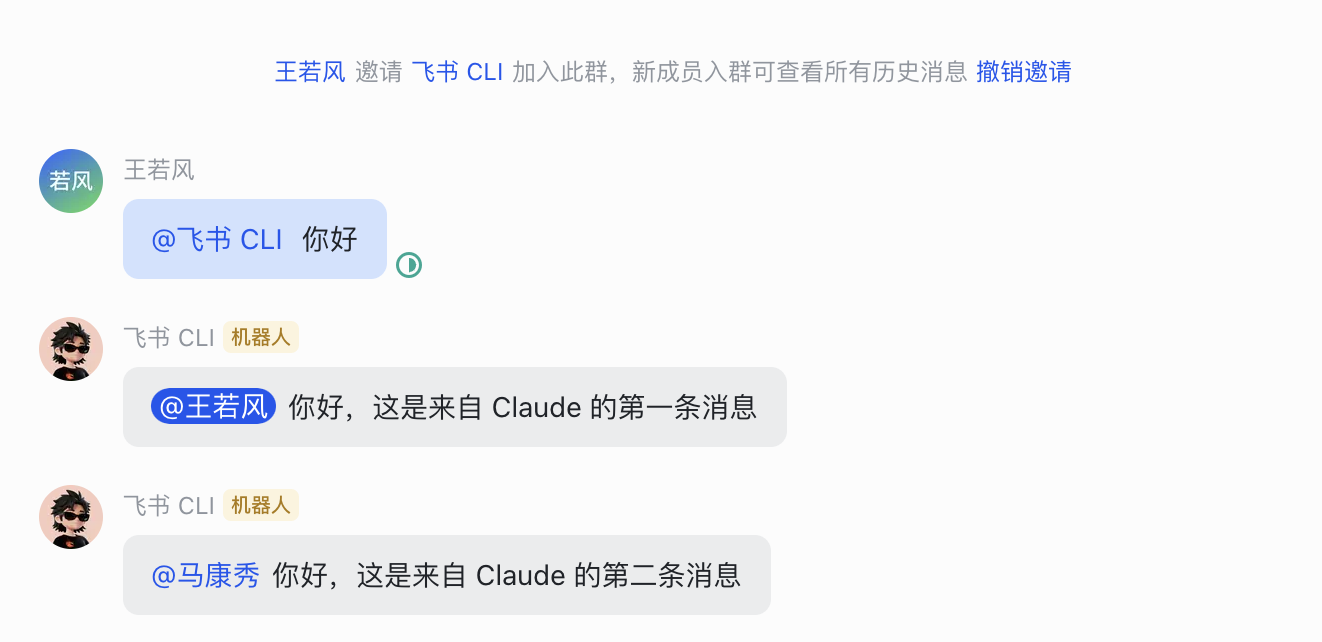 然后就可以在群里通过 CLI 以”飞书 CLI”机器人的身份给群里的人发消息了,下面测试一下。