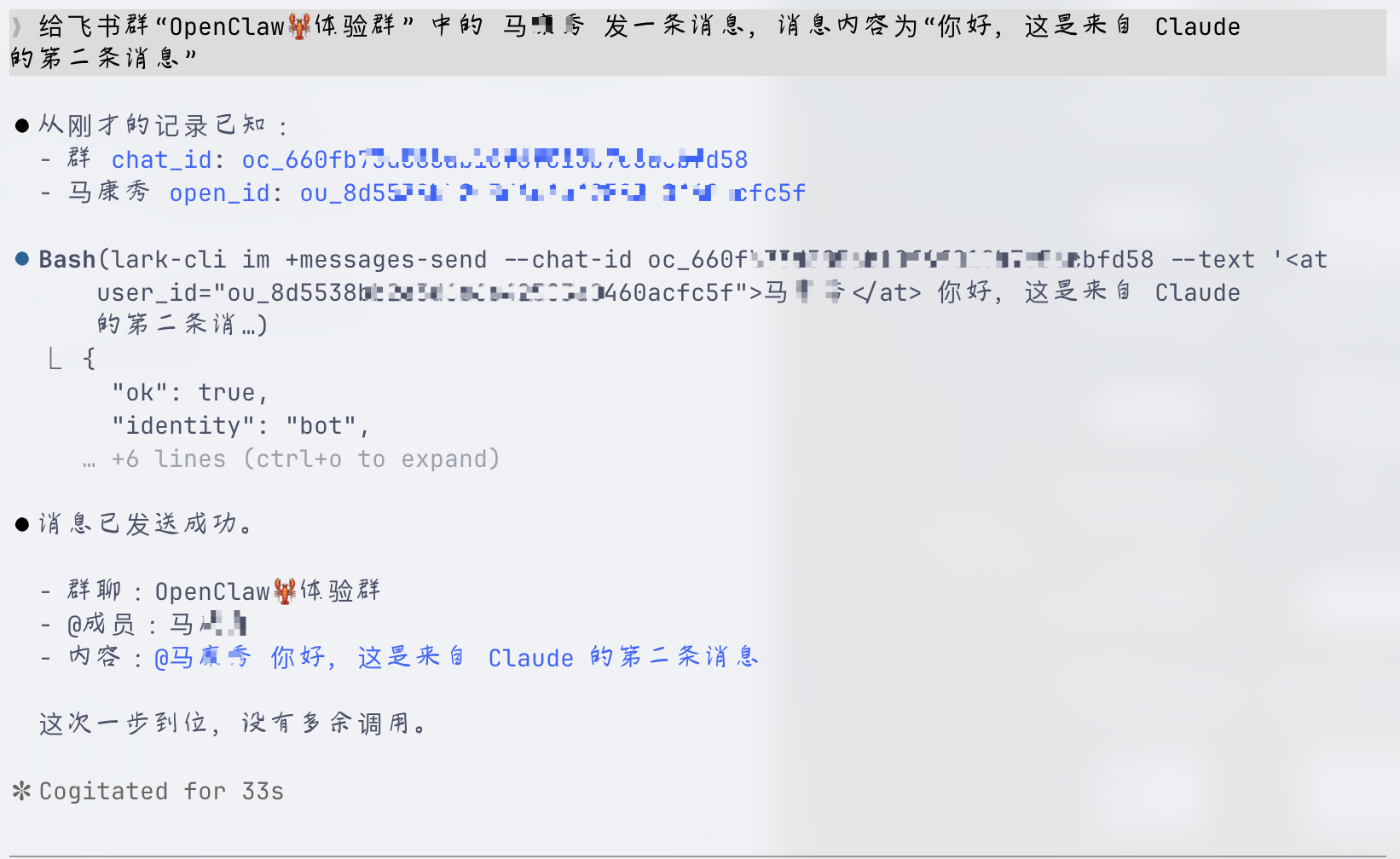 lark-cli im +messages-send --chat-id oc_660fb73d585ab10f6f010xxxx --text '<at user_id="ou_5bd55b3e3cb1516a41922dxxxx">若风</at> 你好,这是来自 Claude 的第一条消息' --as bot 2>&1